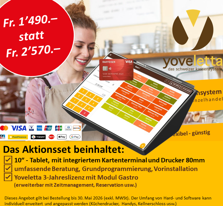 Das Kassensystem Yoveletta ist die Schweizer Cloudkasse für kleine, mittlere und grosse Betriebe aus Gastronomie und Einzelhandel. Ob Imbissstand, Gartenrestaurant, Bäckerei, Foodtruck oder Gault-Millau-Restaurant mit Yoveletta hast du ein sicheres, geräteunabhängiges und einfach bedienbares Kassensystem. Die Tabletkasse Yoveletta eignet sich auch für Geschäfte und Läden aller Grössen, Pop-up Stores und Dienstleistungsunternehmen wie Werkstätten, Garagen, Coiffeure, Kosmetiksalons, Nagelstudios und viele mehr.